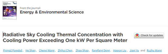Recently, researchers from the Energy-Water-Air interdisciplinary innovation team ITEWA led by Professor Wang Ruzhu from School of Mechanical Engineering at Shanghai Jiao Tong University published an original scientific paper entitled Radiative Sky Cooling Thermal Concentration with Cooling Power Exceeding One kW Per Square Meter in Energy & Environmental Science (IF=32.5). This paper reports a rationally designed and scalable AsymSkyCool method (Asymmetrically-sized heat-source-on-radiative-Sky-Cooling-coated-substrate) that allows generated cooling energy to be concentrated and localized to the heat source. The developed radiative sky cooling thermal concentrator (tcRC) achieves over 2000 W m-2 and close to 1000 W m-2 at almost 500 W m-2 solar irradiation. The nearly tenfold augmentation compared to the state-of-the-art radiative sky cooling concentrators allows efficient, sustainable cooling of energy-dense applications using cold space as a heat sink.