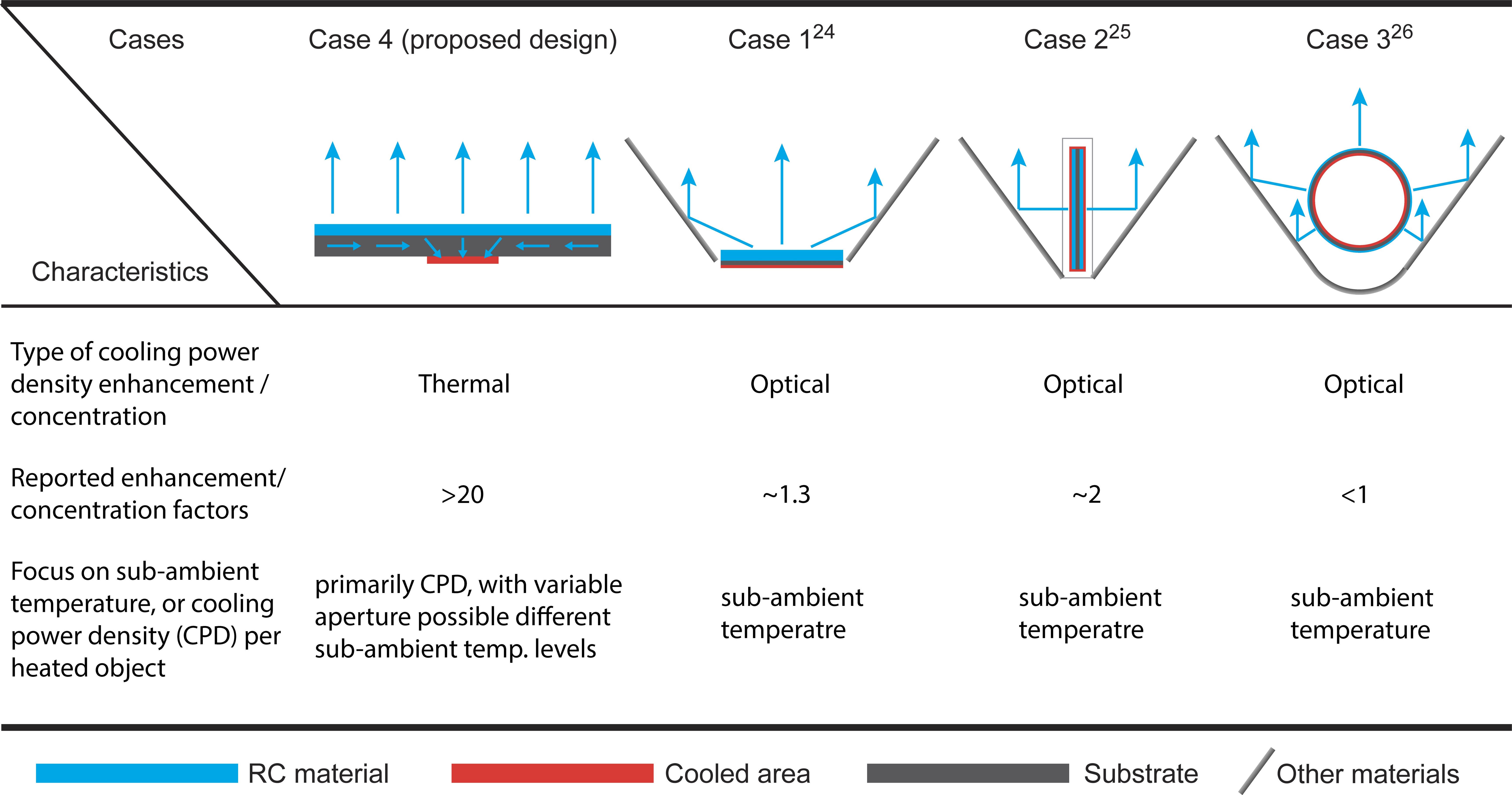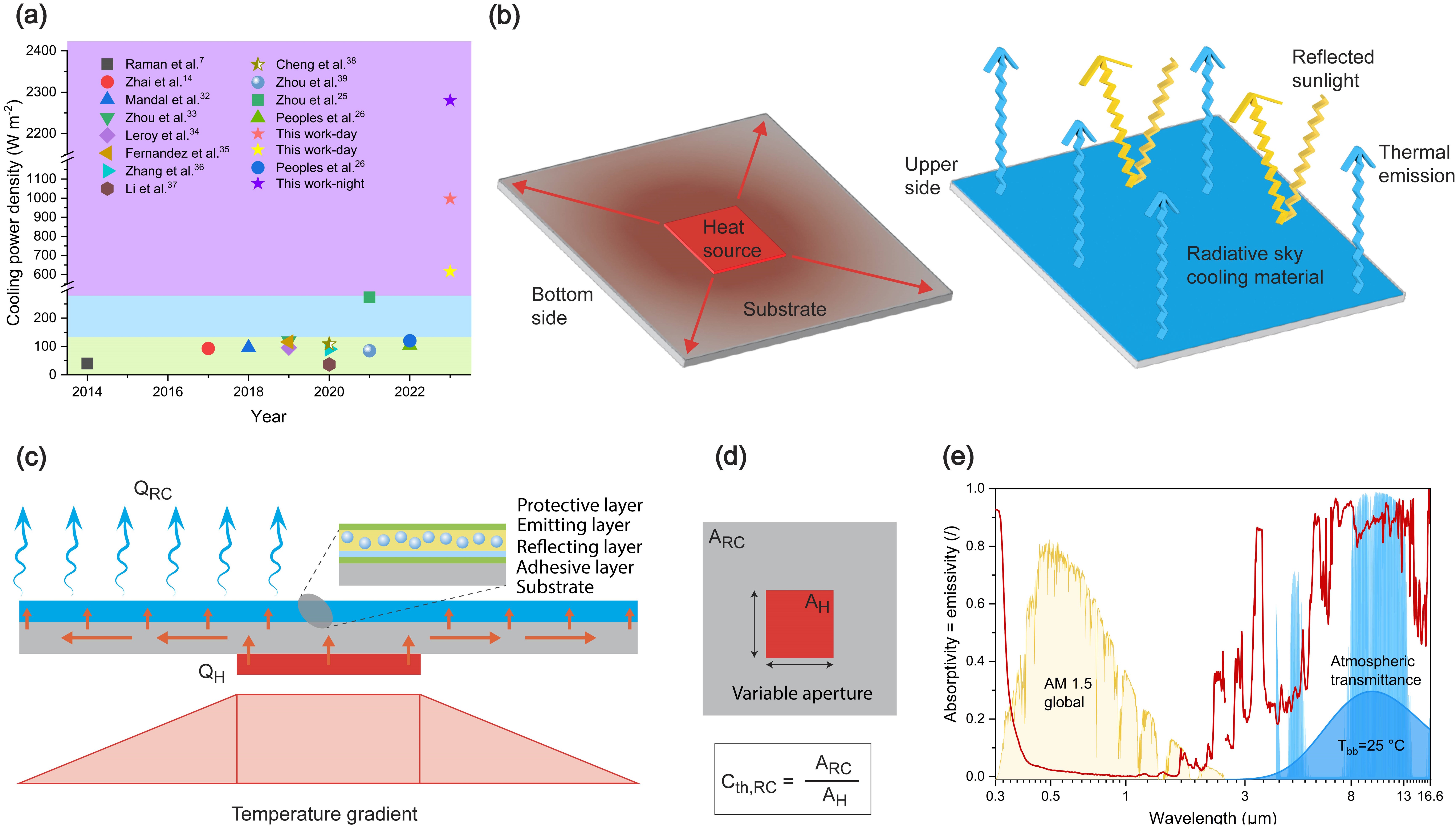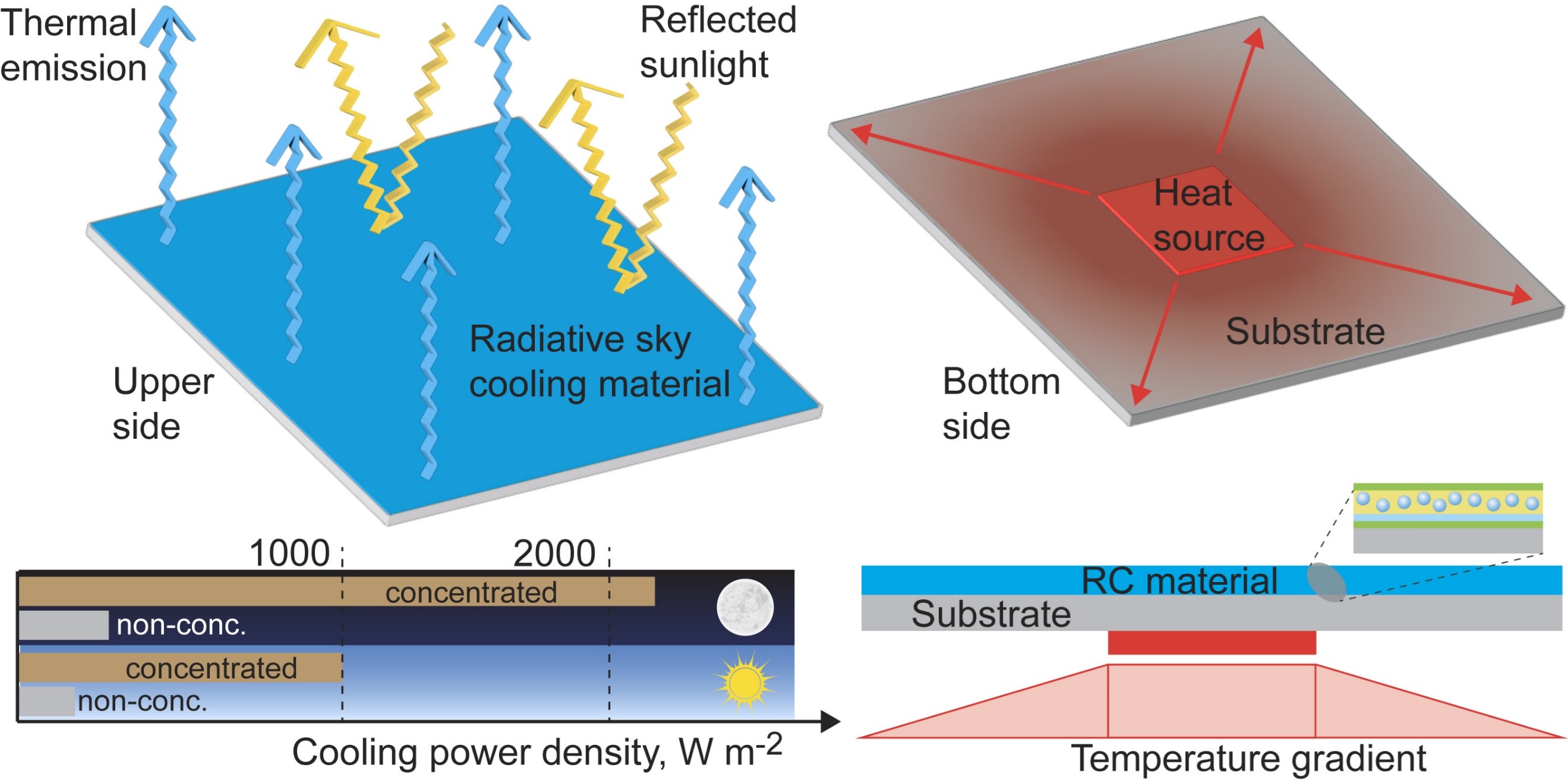 The authors investigated the scalability of the sRC with respect to the thermal concentration factor (Cth,RC), defined as the ratio of the RC material area to the heat source area. The initial experiment using a non-concentrated (Cth,RC = 1) and a concentrated sRC (Cth,RC = 33.6) indicated a colossal ability of the concentrated sRC for heat dissipation. For instance, when delivering the same amount of heat to both samples, the temperature of the non-concentrated sample quickly exceeded 60 °C. In comparison, the concentrated sample still remained at a sub-ambient temperature of –5 °C. The authors also studied the scalability based on real-world experiments in Shanghai and Kunming (China) with a factor in the range of 1-33.6, the largest tcRC efficiency up to 90%, defined as the measured cooling power density versus the theoretical, has been identified for a factor of up to 8. Beyond this value, the efficiency drops. However, the ability to effectively cool energy-dense heat sources increases. To increase the efficiency, the authors also investigated the role of substrate thermal conductivity through three-dimensional (3D) numerical simulations. With the increase of the substrate’s ability to transport heat in the lateral direction, the temperature gradient for efficient cooling energy concentration drastically increases. This insight calls for future scientific research oriented at high thermally conductive substrates coupled with radiative sky cooling materials in monolithic designs.