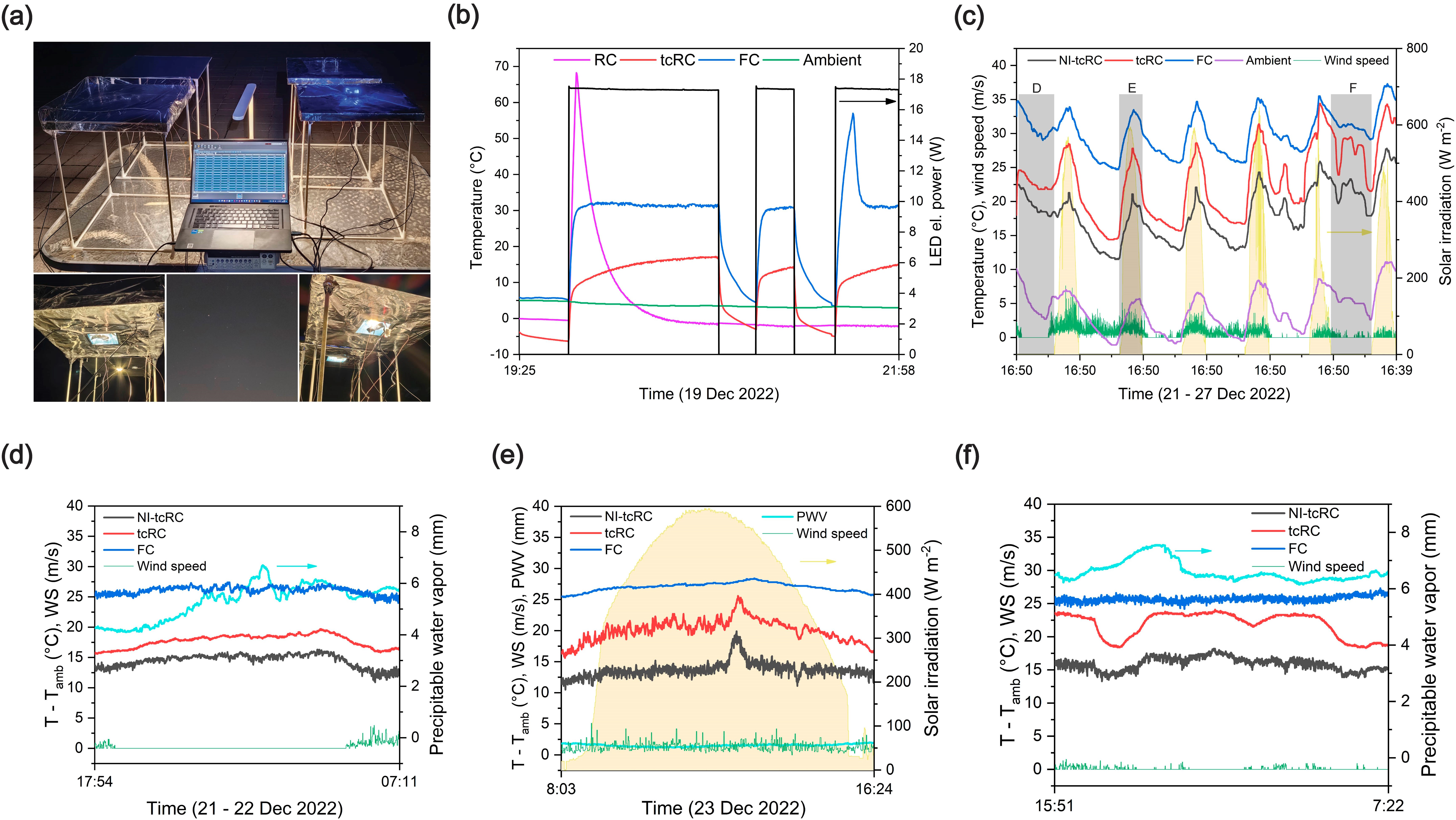 To confirm the effectiveness of the tcRC concept, a total of 66 experiments across three different locations - Ljubljana, Slovenia (46.04° N), Shanghai, China (31.02° N), and Kunming, China (24.86° N) - between August and December were conducted. Such extensive experimental validation affirms the concept's performance fairly across a broader range of ambient temperature and relative humidity conditions, as radiative sky cooling is most affected by the amount of precipitable water vapor (PWV) in the air. This sets the study apart from previous reports, which typically relied on a limited set of datasets from a single location with slight variation in ambient air conditions.