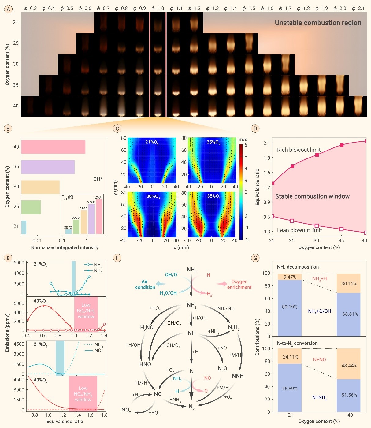 Prof. Yuyang Li’s research group proposed an oxygen-enrichment strategy for ammonia combustion in their 2019 Combustion and Flame paper. They found that only doubling the oxygen content in the oxidizer increased the laminar burning velocity of ammonia fivefold, reaching levels comparable to those of natural gas/air combustion in practical gas turbines. However, previous experiences in hydrocarbon combustion suggested that increased flame temperatures, typically hundreds of Kelvin, under oxygen enrichment could significantly intensify NOx emissions, raising concerns about the potential trade-off between combustion enhancement and pollutant control. To address this issue, the research team investigated ammonia combustion under oxygen enrichment in a single swirl gas turbine model combustor and observed a significant increase in NOx emissions under fuel-lean conditions and a surprising widening of the low NOx/NH3 emission window under fuel-rich conditions. As the oxygen content increased from 21% to 40%, the stable combustion window of equivalence ratio for ammonia swirl flames expanded nearly threefold, from 0.66 to 1.86, while the ϕLE simultaneously increased over sixfold, from 0.05 to 0.31. Kinetic analysis revealed that under air conditions, the ϕLE width was determined by the sufficient reaction between residual fuel and NOx, while under oxygen enrichment, the significantly increased flame temperature enhanced the self-promoted ammonia pyrolysis, promoting an overall increase in fuel pyrolysis rate and suppressing residual NH3 emissions under fuel-rich conditions, thus significantly widening the ϕLE and achieving the simultaneous pollutant control during combustion enhancement under single-stage gas turbine combustion conditions. In the future, further integration with staged combustion techniques could effectively remove residual hydrogen gas in the secondary combustion zone, thereby creating a highly efficient and clean ammonia combustion technology with broad application prospects.
