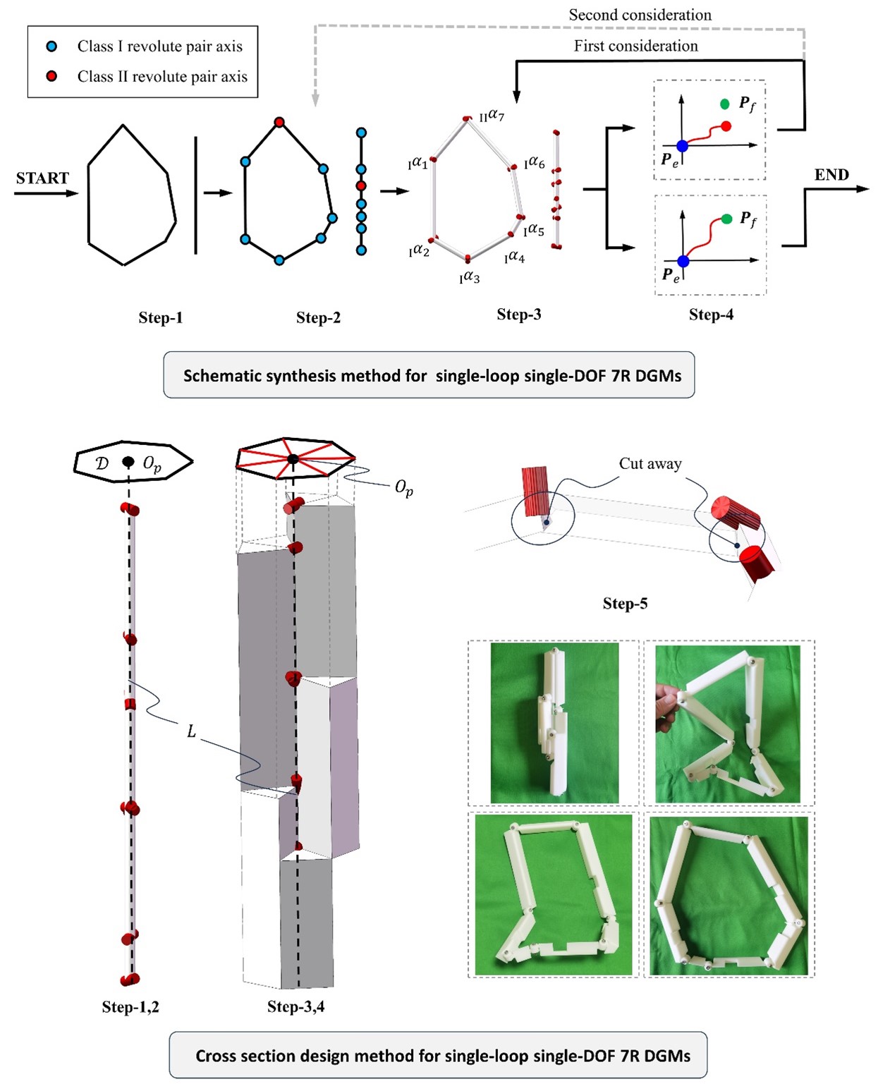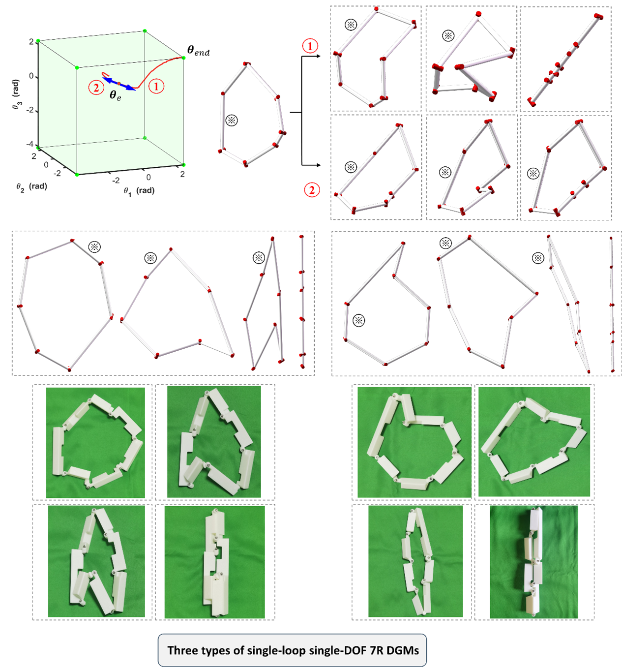 For the schematic synthesis to obtain theoretical mechanism solutions, the research team discussed the layouts and value ranges of two classes of revolute pair axes in the DGM construction process and defined three types of parameters necessary for building DGMs. To design a single-loop single-DOF DGM with any desired deployable polygon shape, the team pioneered the concept of using different states of the DGM to complete the design of different types of parameters. They provided all necessary constraints and their geometric meanings for each type of parameter design. Using a predictive-correction method, they solved the path search problem in the implicitly defined configuration space, forming a schematic synthesis method capable of designing all single-loop single-DOF 7R DGMs without over constraints. The idea of using different states of DGMs to complete the design of different types of parameters can be extended to the schematic design of other types of DGMs.