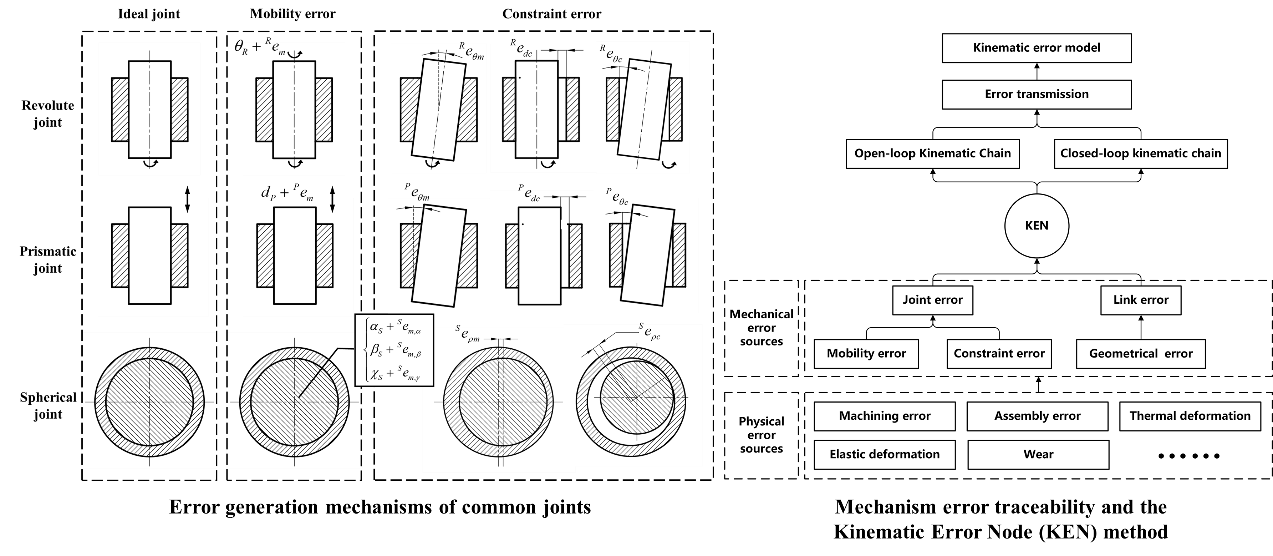 Recently, Professor Weizhong Guo’s team from the Institute of Advanced Equipment Design and Control Engineering at the School of Mechanical Engineering, Shanghai Jiao Tong University, published a research paper in the international journal Mechanism and Machine Theory, titled 'A complete approach for error modeling based on failure of geometrical constraint and kinematic error node (KEN)'. In this work, the team is the first to propose a novel error generation mechanism based on the failure of geometric constraints in kinematic pairs, and introduce the new concept of Kinematic Error Node (KEN). Building on this foundation, they established a theoretically complete method for mechanism error modeling. This approach decouples the analysis of motion error from the physical cause of the error, enabling the construction of mechanism error models directly from error sources rather than relying on the differential of kinematic models. This advancement not only promotes the development of mechanism error modeling theory but also provides a new pathway for integrating precision considerations into the early stages of mechanism design. The paper's first author is Ziyue Li, a Ph.D. student (class of 2021) at the Institute of Advanced Equipment Design and Control Engineering, and Professor Weizhong Guo is the corresponding author.