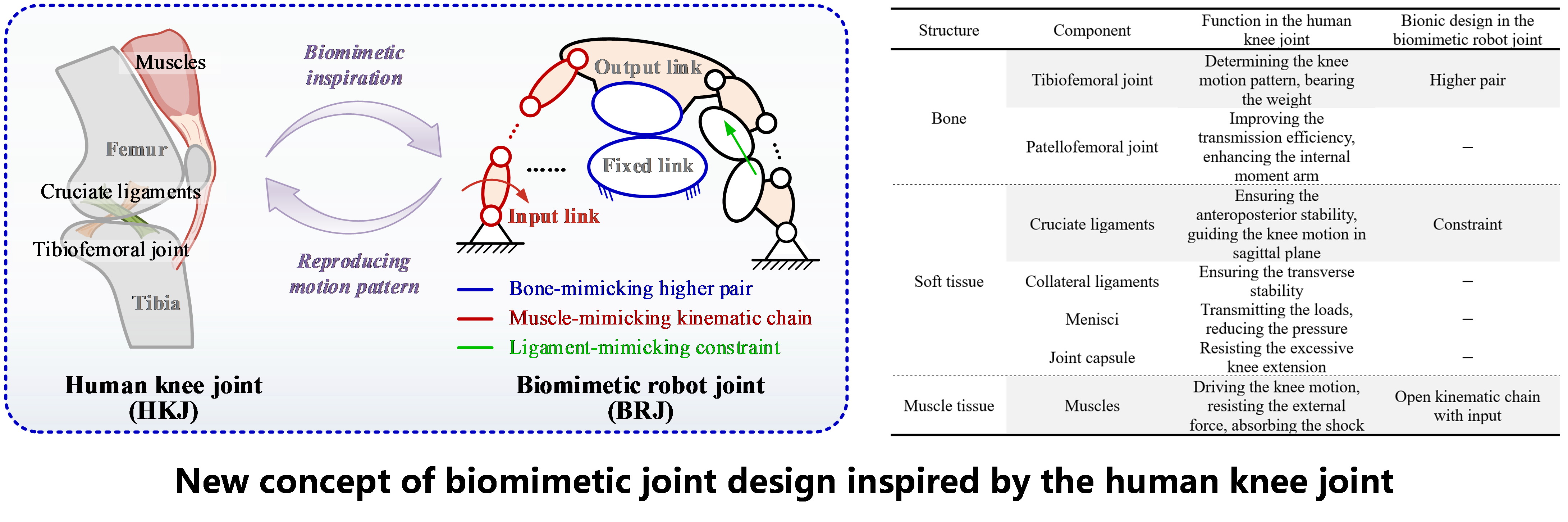 To address this, the research team utilized mechanism theory to deeply analyze the motion mechanism of the human knee joint’s physiological structure. The team extracted core mechanical components from three aspects: the rolling-sliding contact between the bones, the constraint function of the cruciate ligaments, and the driving role of the attached muscles, thereby revealing the mechanical principles behind the knee joint’s varying ICR motion. Based on this, the team proposed a new biomimetic joint design concept inspired by the human knee joint: modeling the tibiofemoral joint as a conjugate contact higher pair, equating the cruciate ligaments to the constraints required for maintaining one DoF motion, and modeling the attached muscles as a motion chain with input. This concept creates a mapping paradigm from the “bone + ligament + muscle” in the human knee joint to the “conjugate higher pair + constraint + active motion chain” in the biomimetic joint, which forms a new biomimetic modeling framework and provides a theoretical foundation for designing biomimetic joints enabling complex motion.