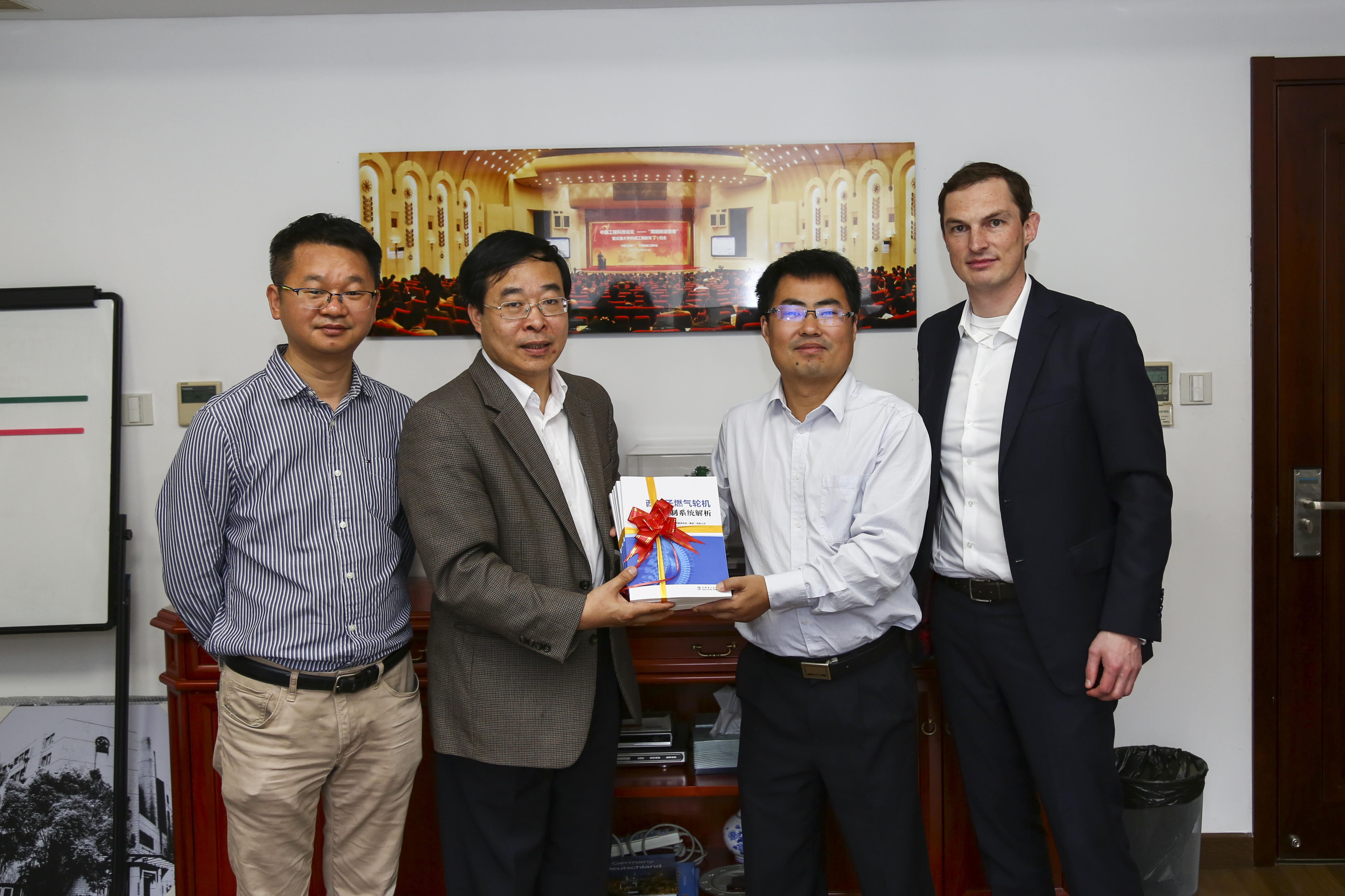 公司教师彭迪、夏唐斌作为联合培养博士生导师与周业涛、Neuenhahn共同在合作协议上签字。周业涛代表西门子公司向公司捐赠近百本燃机领域的书籍。