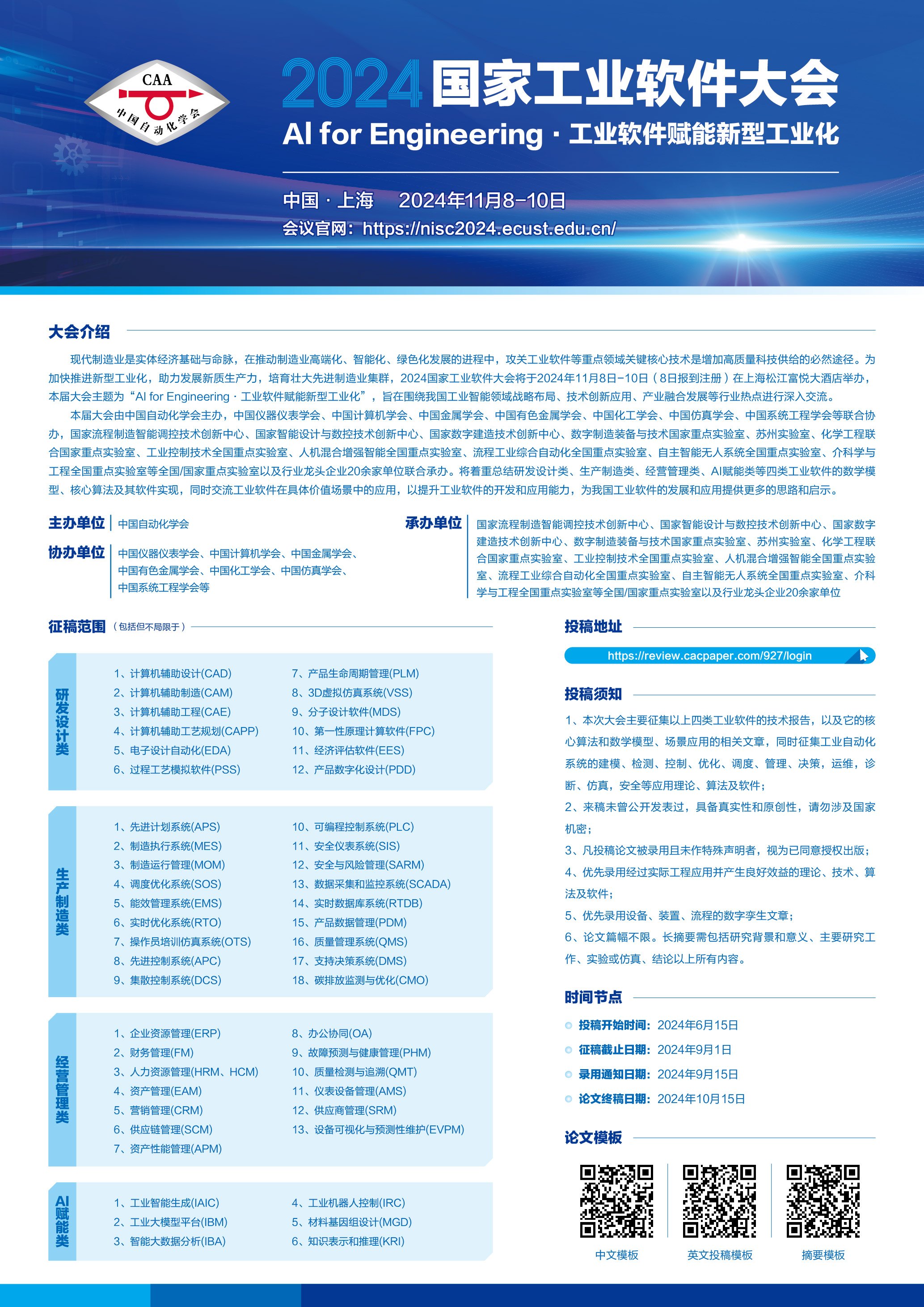 1、大会主要征集研发设计类、生产制造类、经营管理类、AI赋能类等四类工业软件的技术报告,以及它的核心算法和数学模型、场景应用的相关文章,同时征集工业自动化系统的建模、检测、控制、优化、调度、管理、决策,运维,诊断、仿真,安全等应用理论、算法及软件;