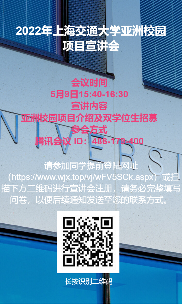5月9日(周一)公司研究生院将举办“2022年伟德国际1946亚洲校园项目线上宣讲会”,届时将为大家详细讲解亚洲校园项目、双学位生招募等内容。同时,将邀请往届学员进行学习体验分享。