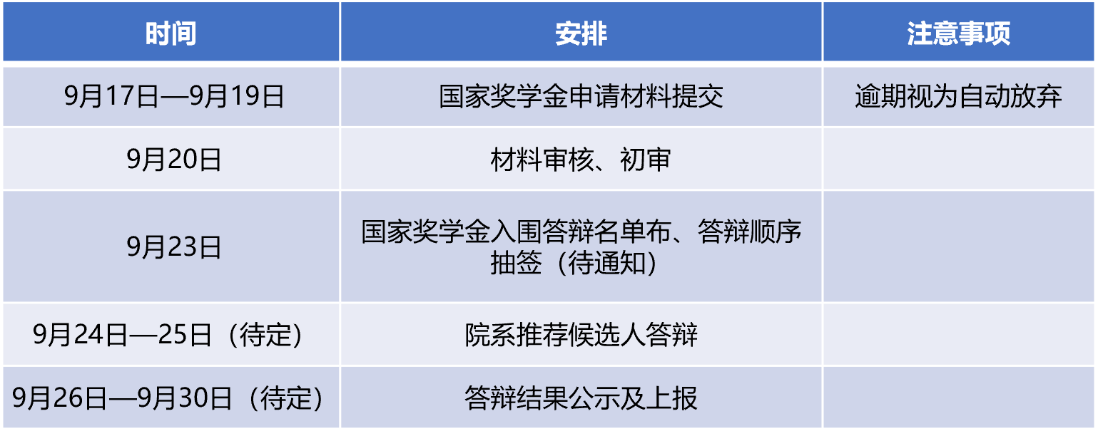 2018-2019学年研究生国家奖学金评审工作现启动,具体办法、申请表格等材料请查看附件文件。此次奖学金评审安排如下: