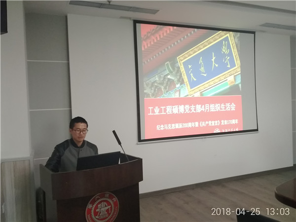 4月25日下午,伟德国际1946工业工程系硕博党支部在机动公司F210召开了4月份的组织生活会。生活会主题为“纪念马克思诞辰200周年暨《共产党宣言》发表170周年” ,会议由支部书记殷亚祥主持。