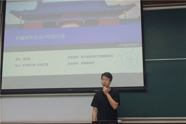 其次介绍的是来自机械工程专业的苗浩原学长。苗浩原学长首先介绍了机械类的毕业设计(包括设计类,算法应用类,建模仿真类),其次介绍了成绩组成以及答辩流程,还简要介绍了“恒星杯”毕业设计大赛。最后学长也结合自身经历进行了经验分享,包括如何选题、如何进行项目推进和管理等。