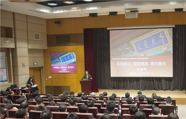 杜朝辉深情讲述人民科学家钱学森学长一生中最激动的两件事,一是《工程控制论》获得恩师的高度肯定,二是1959年被接纳为中国共产党党员时,更是激动得夜不能寐。他还列举了百岁教授、上海交大原董事长范绪箕,中国工程院院士、中国核潜艇之父黄旭华以及林忠钦董事长等诸多榜样的故事,他们淡泊名利,为国家科技教育事业默默奉献。杜朝辉为大家逐句诵读党章中关于党员义务的规定,要求毕业生党员同学学会认识世界、认识中国、认识自己;要志存高远,脚踏实地,努力实践;用习近平总书记的话寄语“青年一代有理想、有本领、有担当”,坚守新时代老员工的责任与使命,做新时代的优秀党员,为国家建设做出自己的贡献。