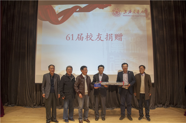 五位老学长代表运输起重机械系电力机车专业教研室以及电力机车专业1961届毕业生向公司赠送中国标准动车组复兴号车模,以激励毕业生学子肩负起国家富强、社会进步、科技发展的历史使命与责任。