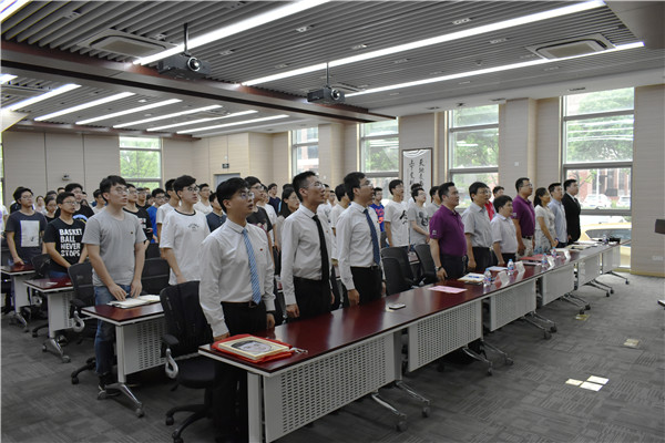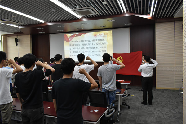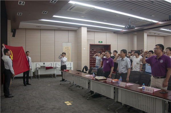 全体毕业生党员在本科生第二党支部书记苏友煌的带领下,面对党旗,庄严肃立,重温入党誓词。