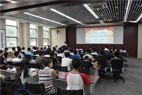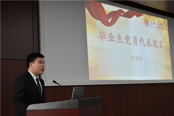 毕业生党员代表、本科生第三党支部书记廖书恒在发言中回顾了2014级本科生党员成长的点点滴滴。他希望青年党员学子以实际行动践行习近平总书记北大师生座谈会上对青年人提出的时代要求:爱国、励志、求真、力行,在奋斗中释放青春激情、追逐青春理想,胸怀祖国,心怀人民,以青春之我、奋斗之我,为民族复兴铺路架桥,为祖国建设添砖加瓦。作为钱学森班的毕业生,他将赴美国西北大学攻读博士学位,用自己的努力为中国制造2025奉献力量。他说:“钱学森学长的精神早已融入我的血液,无论走多远,也要回来,因为这里有我的初心,因为这里是我的祖国。”最后,他代表2014级毕业生党员郑重承诺:将谨记“饮水思源,爱国荣校”之校训,恒德惟实,精勤不倦,任事足践,平实图成,志存高远,以传承文明、探求真理为己任,为振兴中华、造福人类而奋斗终身!