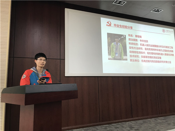 制造所研究生党支部、机器人所研究生党支部、机电所研究生党支部、制冷所研究生党支部、发动机所研究生党支部、车身所硕士生党支部、汽车电子所研究生党支部、工业工程与管理系研究生党支部、内燃机所研究生党支部、热能工程所研究生党支部等支部纷纷开展毕业生成长感悟及经验交流分享会。有的毕业生介绍了自己在交大学习、科研、生活的感悟,分享自己求学、求职的心路历程;有的毕业生从生涯规划、论文撰写与投稿等方面为学弟学妹们做了经验分享和具体辅导。他们纷纷表示,有自开阔的视野,尽早找到自己的方向,并关注行业发展。要提前做好适合自己的职业规划,做充足准备,注意培养学习能力和沟通能力,在面临选择时不要迷茫;在科研工作中,从内容、方法、问题和应用四个方面提升科研能力;要认准自己未来的发展方向,将来无论在什么岗位上,都要做到敢于担当,肩负起自己的责任,并把个人价值的实现和国家战略需求结合起来,养成投身国家重点行业的家国情怀。