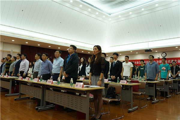大会在庄严的国歌声中拉开序幕,杜朝辉、巢睿祺、张文明、郭晨雨为研代会致辞。