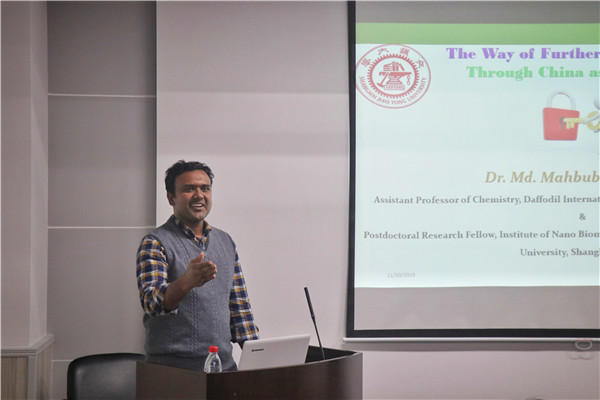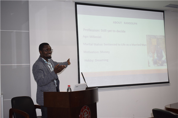 第三位主讲人Mahbubur首先指出了出国深造的重要性,并从语言、经费、毕业年限、生活状况等方面对选择中国还是其它国家进行了比较。最后,他具体分享了如何选择留学国家、申请留学的步骤和一些小技巧。