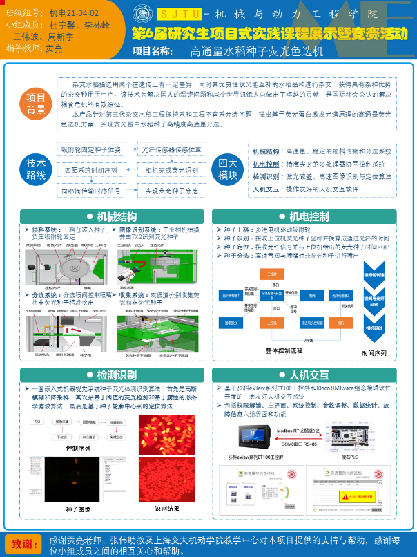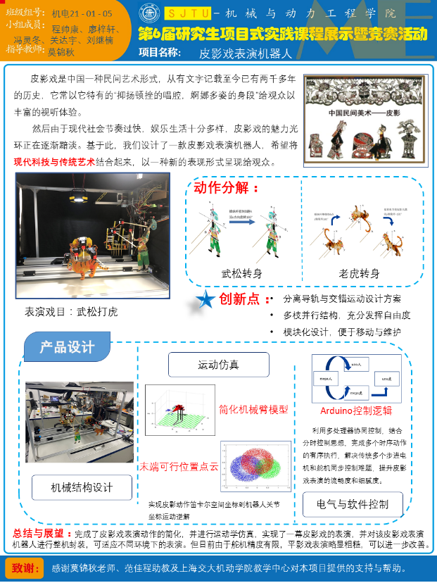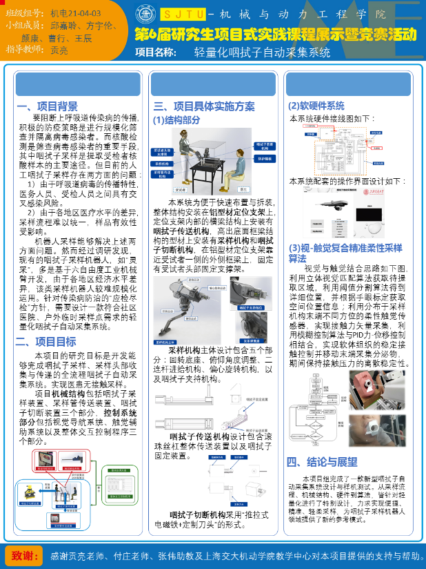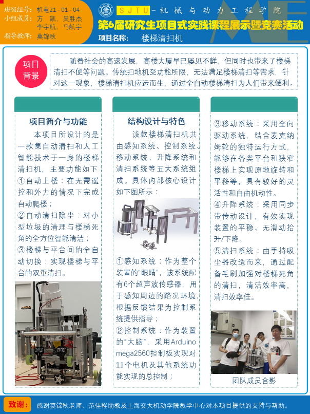 专业学位研究生项目式实践课程《复杂机电/动力系统的设计与实践》,自2013年设立至今,已形成了完善的教学大纲、实践平台和教学团队队伍,提高了员工的实践和创新创业能力,课程项目成果得到了社会和企业的认可。未来,项目式实践课程将深入挖掘和对接企业、市场需求,拓宽交叉学科项目设计,以创新竞赛等为牵引,搭建员工创新产品孵化器,培育富有创新力及应用价值的高水平作品,进一步提升专业学位研究生的综合工程实践能力。
