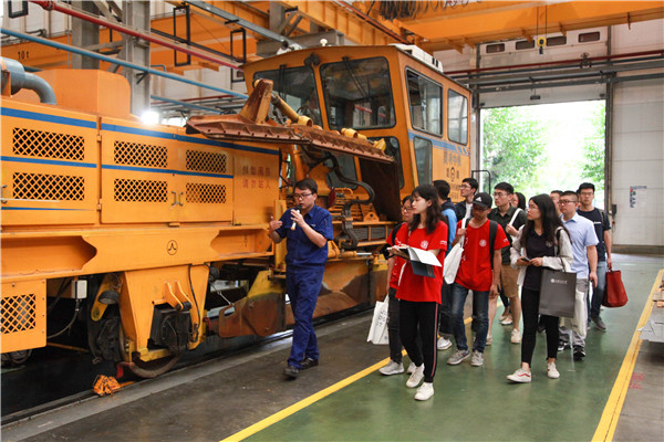 25日上午,实践团成员赴中国铁建高新装备股份有限公司进行实践活动。在人力资源部的带领下,实践团先后参观了企业文化展厅、铁建装备的结构分厂、机加工分厂、总装分厂等。中国铁建高新装备股份有限公司始建于1954年,是中国铁路大型养路机械的行业的领军企业,隶属于世界500强的中国铁建有限公司,是亚洲第一、世界第二的铁路大型养路机械制造商,为中国铁路大面积提速扩能、运输安全的保障等发挥了重要作用。