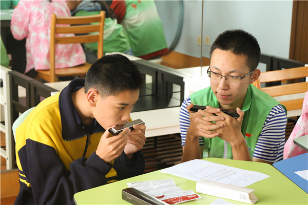 下午一点左右,志愿者们抵达启智公司,稍做准备后,就看到一群孩子又蹦又跳地进了阶梯教室。志愿者们走到孩子中间,十分随和亲切地同他们交流,并开始了一对一的口琴教学。孩子们对口琴、对音乐都表现出了浓厚的兴趣。他们点点乐谱,又看看手里的口琴,再用力的吹气——美妙的音符升起了孩子们灿烂的笑脸。志愿者们积极耐心地与孩子们沟通,解决吹奏上的一个个小难题。教室里蔓延着阵阵乐声与欢笑声。