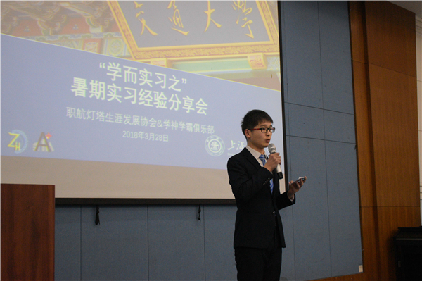 3月28日晚,“学而实习之”暑期实习经验分享会在逸夫楼200号举办。本次活动由职航灯塔生涯发展协会和学神学霸俱乐部联合举办。机械动力公司员工胡寒江、欧阳崛和叶维熊受邀出席讲座并分享自身实习经历。活动由韩潇主持。