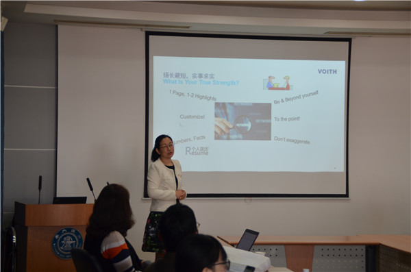 11月1日上午,由机械动力公司研究生会实践部主办的“砺职践行”系列活动——职业技能培训在机械楼F310举行。本次培训邀请到了福伊特公司资深HR Lilian女士和Ana Xu女士,就同学们在求职过程中最为关注的简历制作和面试技能进行培训,并对大家的职业发展中存在的困惑给出了专业的指导。公司职业发展中心主任阮海涛出席本次活动,活动由院研究生会孙延鑫主持。