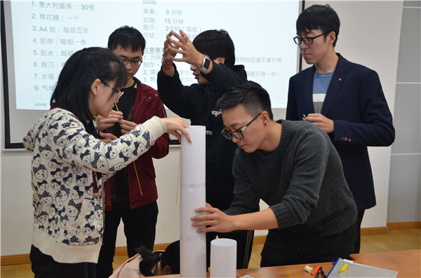 接下来的互动环节,Lilian女士将在场的同学分为观察者和执行者各两组。由执行者用给定的材料搭建福伊特之塔,观察者则扮演面试官观察并评价执行者的表现。最后Lilian女士进行了总结并分享了面试官的观察要素:脑力、沟通能力、领导力和团队合作能力。