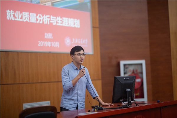 公司员工职业发展中心赵航,做了题为“就业质量分析与生涯规划”的报告。赵航介绍了2019届毕业生去向统计,详细讲解了各类毕业去向的特点,鼓励同学选择科学研究,选择到国家重点行业和关键领域工作。