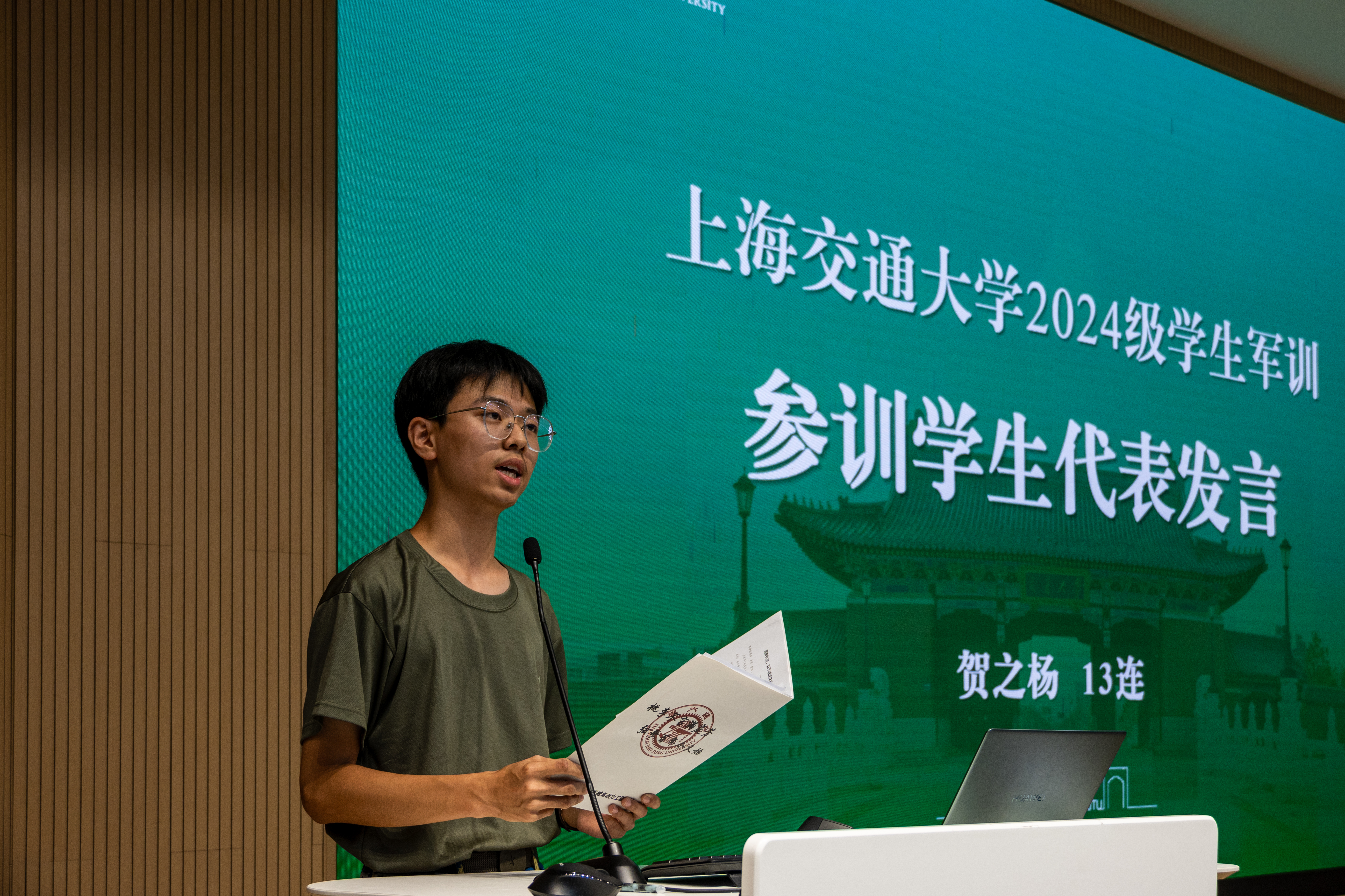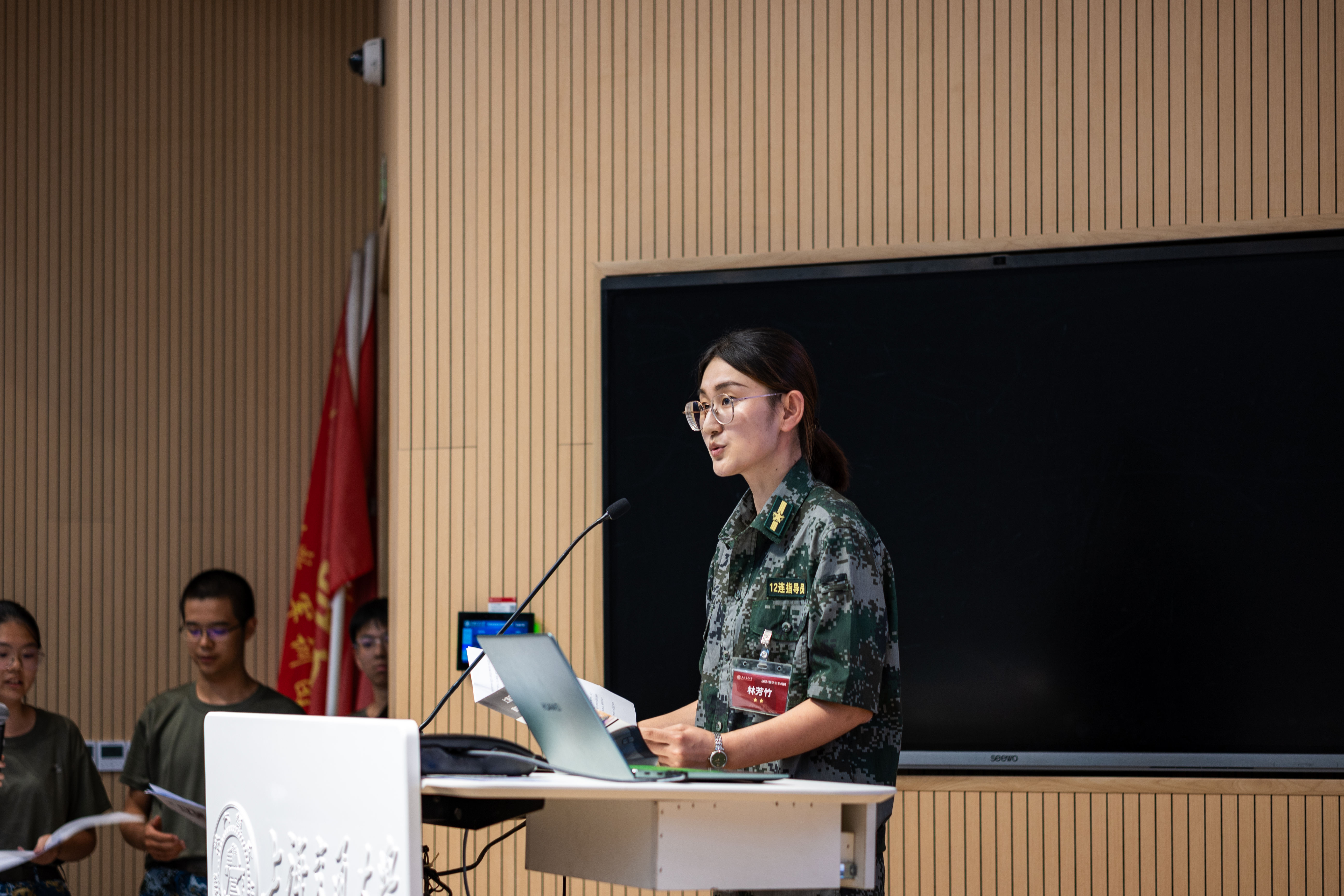 2024级年级思政组长林芳竹作公司员工参训情况汇报,表示参训员工在作训、政工和内务等方面均取得了优异成绩,希望参训员工继续树立“安全第一”的思想,践行交大“军政双训”的理念,在丰富的军训活动中强健体魄、强化纪律、磨练意志、锤炼作风。