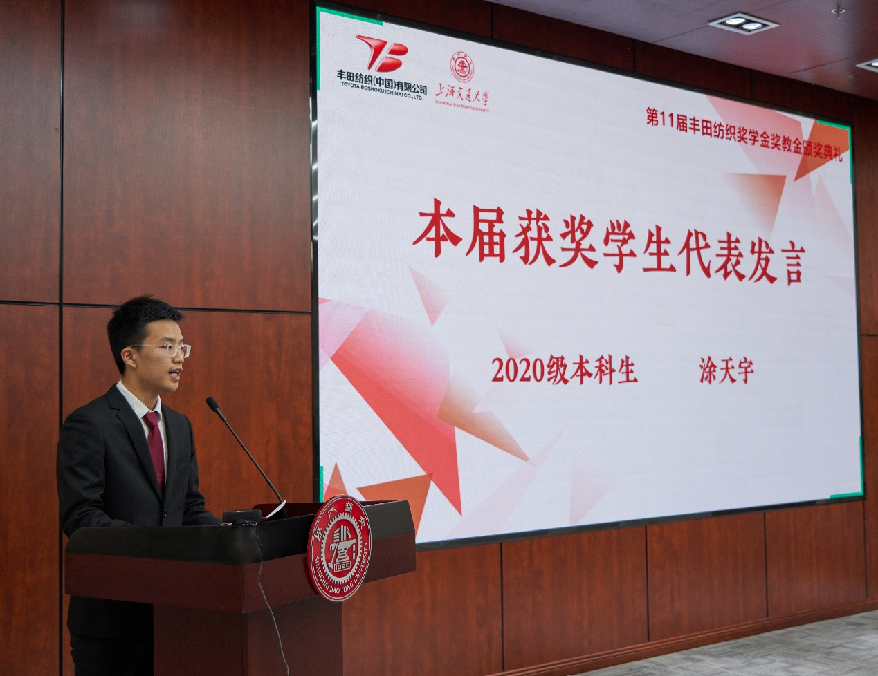 获奖员工代表涂天宇结合自身学业与心路历程,表示将牢记饮水思源、爱国荣校的校训,脚踏实地、追求卓越,成为有理想、有能力、有担当的新时代青年。会上播放了往届获奖员工发展情况视频,往届获奖员工表达了对丰田纺织的感谢和祝福,表示将志存高远、踔厉奋发,以行动书写精彩人生。杨丽丽介绍了丰田纺织公司和奖学会的相关情况。