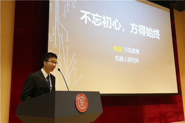 随后,2019年中科新松奖学金(特别奖)获得者陈晨和2019年长江思源科创奖学金获得者蔡易林分别作为员工代表发言。陈晨总结了读博生涯,他表示读博很累但是很酷,他也希望同学们坚持心中所想,享受科研,做到不忘初心方得始终。蔡易林回顾从初入交大到选择科研开拓自己可能性的过程,希望能为自己认可的价值永远坚持,永远青春。