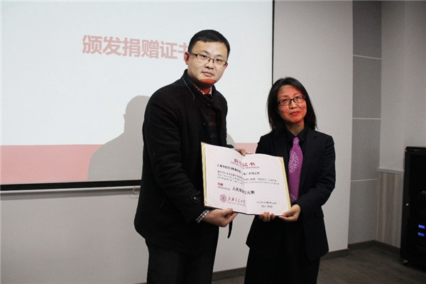 李玉阳代表公司向三菱电机空调影像设备有限公司颁发了捐赠证书。