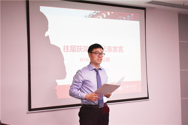 来自A1402093班的博士生高展代表往届获奖员工发言。高展介绍了自己过去一年以来取得的成绩,对丰田纺织表达了诚挚谢意,同时对今年获奖同学表示祝贺。