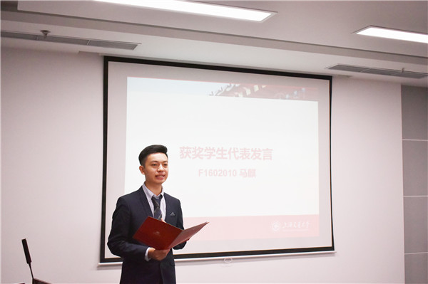 来自F1602010班的本科生马麒代表本届获奖员工发言。他表示获得丰田纺织奖学金是对自己综合表现的肯定,今后将不忘初心,更加努力,争取取得更大成绩。