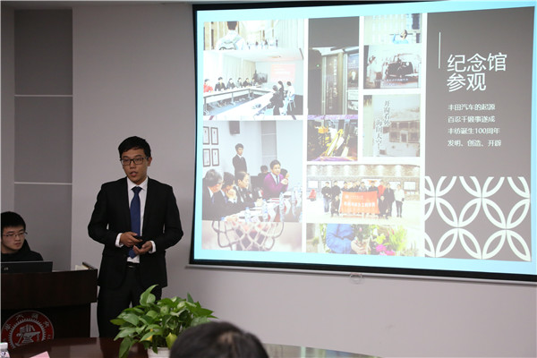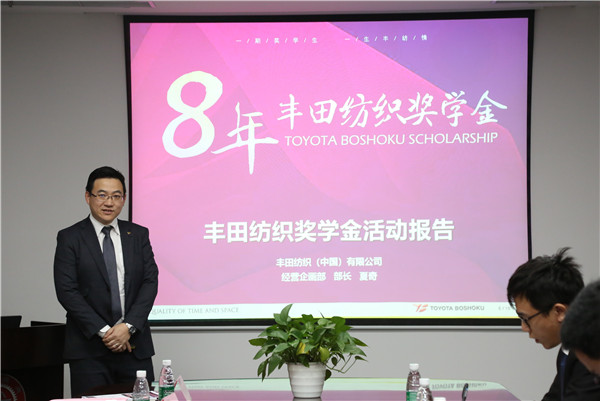 夏奇以“八年丰田纺织奖学金”作了丰田纺织奖学金2019年度活动报告,介绍了丰田纺织的发展并回顾了往期活动,同往年获奖同学的交流情况。