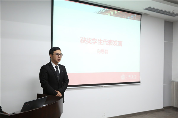 向思磊代表本届丰田纺织获奖员工发言。他介绍了自己近一年取得的成果,表达了对关心和帮助自己的老师的感谢、对设奖方的感恩,表示自己会通过努力取得更大成绩向企业和公司汇报。
