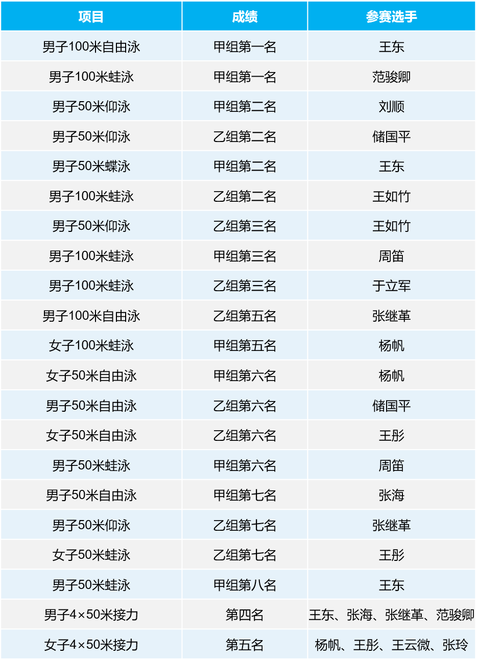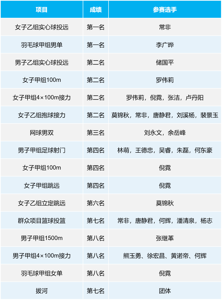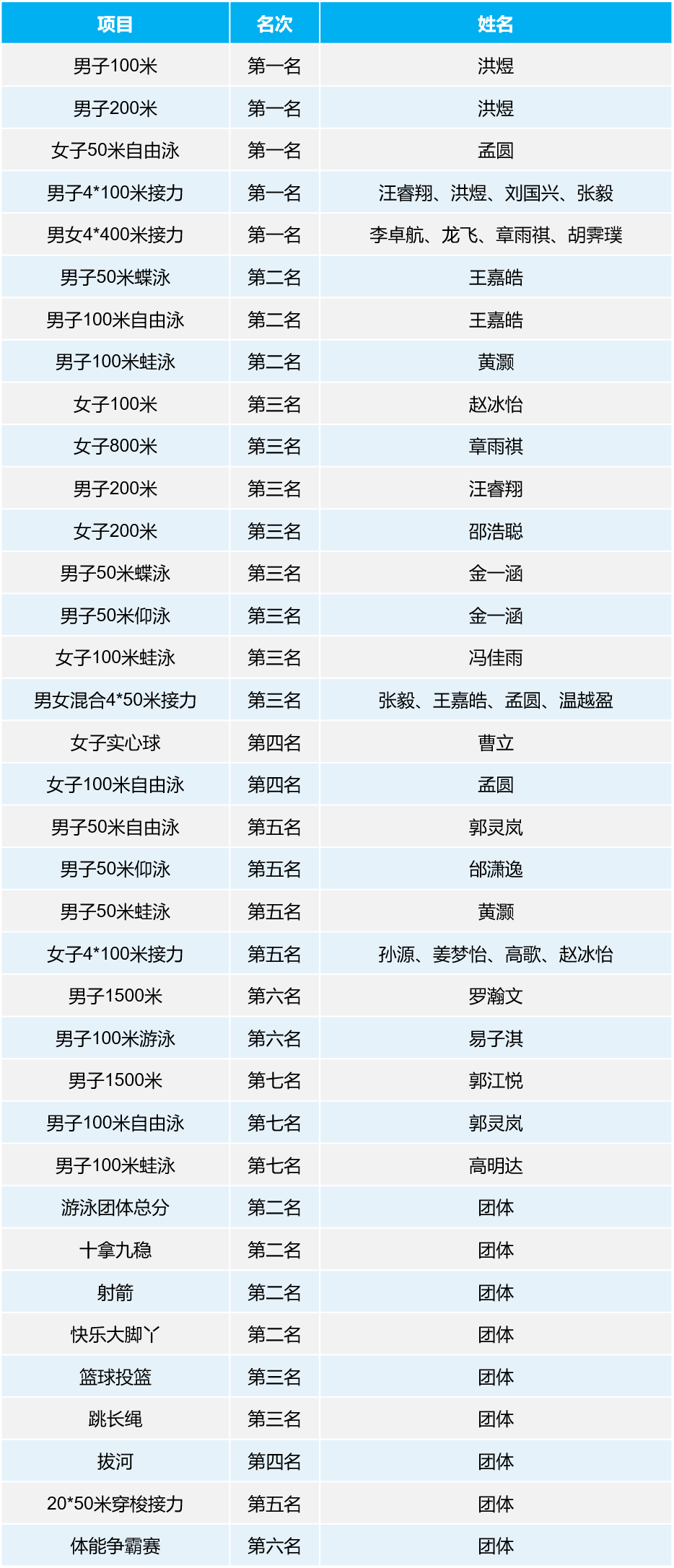 集体项目和个人项目中,公司教职工在游泳、羽毛球、实心球投远中奋力拼搏,勇夺冠军,公司员工在女子50米自由泳,男子100、200米,男子4*100、4*400米接力中获得第一名。此外,公司师生在立定跳远、射箭、篮球等比赛中也获得了较好成绩。