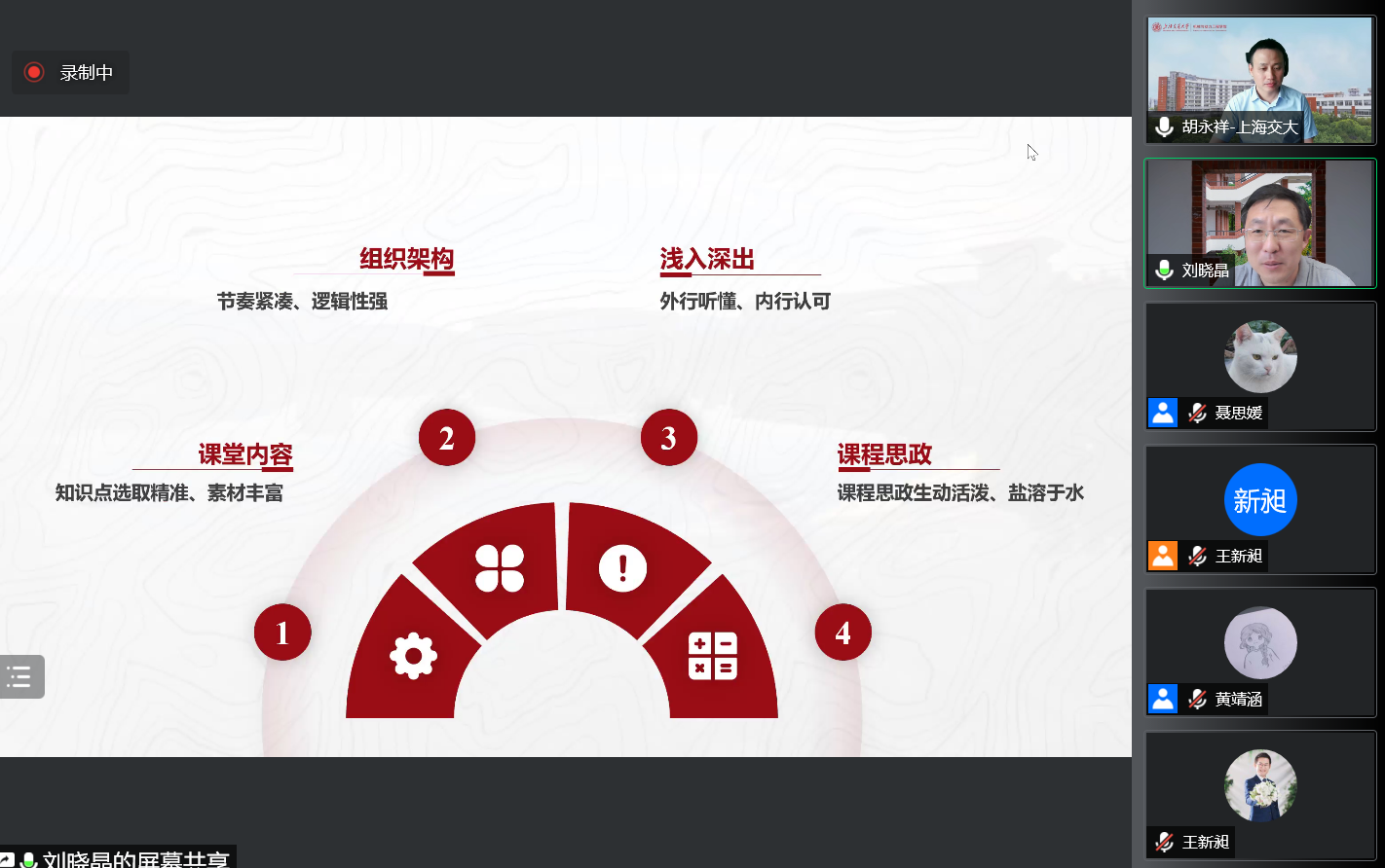 刘晓晶从参赛PPT内容、教学设计和教学反思三个方面分享经验,强调应精准选取知识点,保证教学内容组织架构的紧凑性、逻辑性,浅入深出,做到“外行听懂,内行认可”,并结合讲课内容积极开展课程思政教育。刘晓晶还建议参赛教师使用引起兴趣的导入部分、深入分析问题的理论部分及具有工科课程特点的应用部分“三段法”展开教学,并在课程受众、学情分析、课程内容、课程难点等方面开展教学反思。