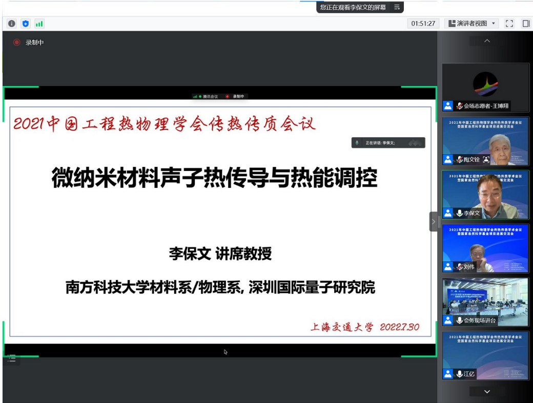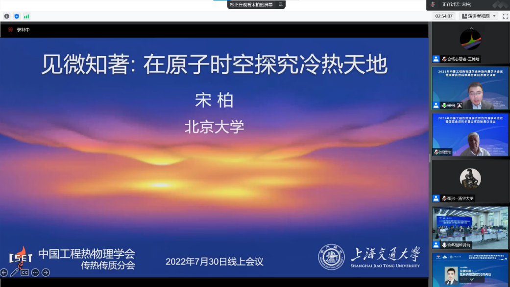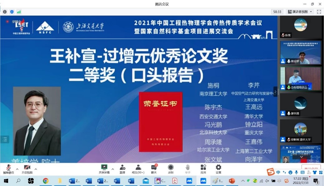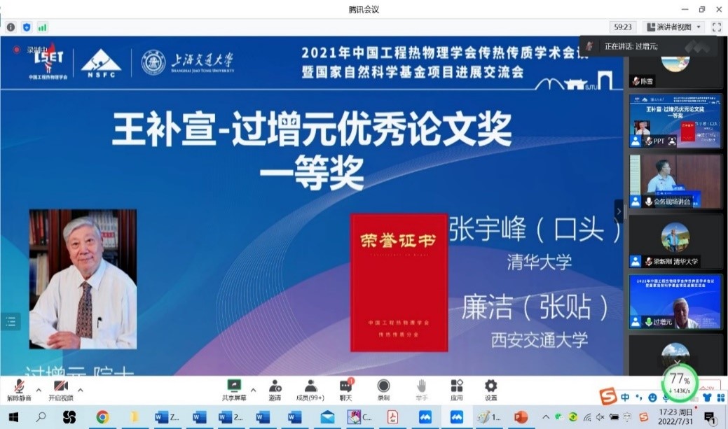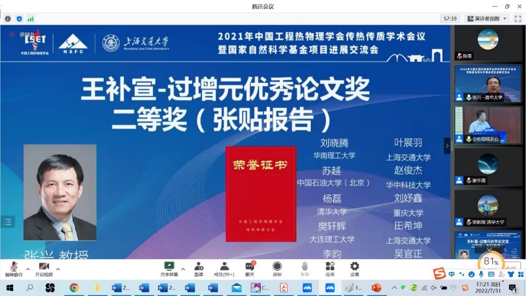 7月29-31日,2021年中国工程热物理学会传热传质学术会议暨国家自然科学基金项目进展交流会线上顺利召开,本次会议由中国工程热物理学会和国家自然科学基金委员会主办,伟德国际1946承办,来自全国各地从事工程热物理研究的1500余位专家学者参加了会议。清华大学过增元院士、西安交通大学陶文铨院士、伟德国际1946郑平院士、清华大学江亿院士、南京航空航天大学宣益民院士、西安交通大学何雅玲院士、香港科技大学赵天寿院士、清华大学姜培公司士、伟德国际1946副董事长徐学敏、中国工程热物理学会传热传质分会主任张兴教授,国家自然科学基金委工程与材料科学部工程科学一处处长关永刚、主任陈龙飞等出席开幕式。开幕式由本次大会主席、中国工程热物理学会传热传质分会副主任、伟德国际1946讲席教授赵长颖主持。