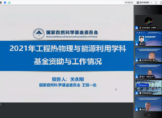 大会主题报告环节,西安交通大学陶文铨院士和清华大学张兴教授分别担任上、下半场执行主席。清华大学江亿院士,欧洲科公司院士、南方科技大学李保文教授,北京大学宋柏研究员分别作“传热传质过程中的不匹配概念及在供热空调中的应用”、“微纳米材料声子热传导与热能调控”、“见微知著:在原子时空探究冷热天地”大会主题报告。关永刚作“工程热物理与能源利用学科基金资助与工作情况”大会主题报告,详细介绍了学科项目申请资助情况、科学基金改革与学科工作等情况,建议大家在原创项目、联合基金和重大项目方面提前布局,聚焦“卡脖子”瓶颈问题,培育出更多引领性的原创成果。