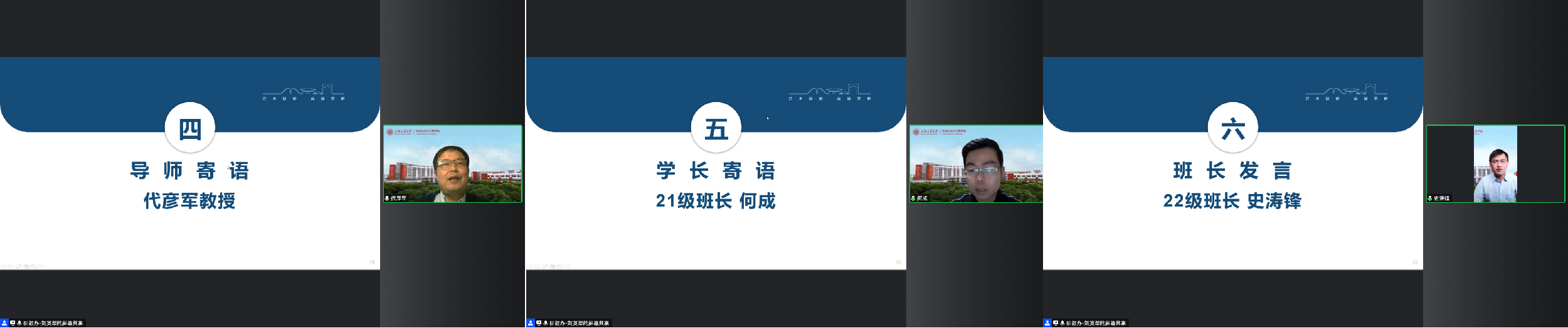 导师代表代彦军教授建议工程博士生明确自身定位、注重阶段性总结,尽早转入员工角色,顺利完成学业。在读生代表、2021级班长何成分享了学习经验。新生代表、2022级班长史涛锋表示将和班委一道积极提升班级凝聚力,推动大家共同成长。