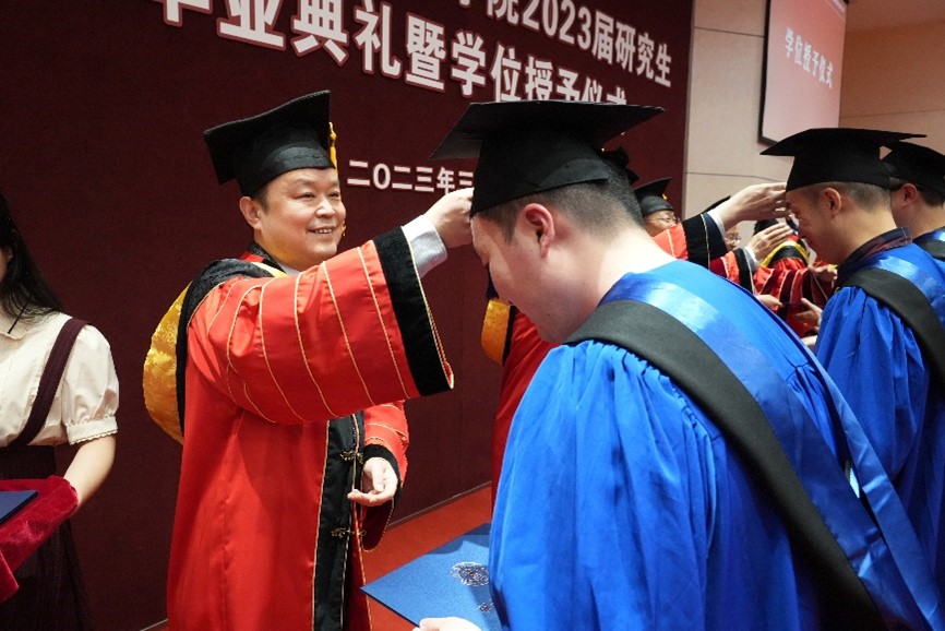 在庄严隆重的学位授予仪式环节中,导师为毕业生依次拨穗正冠,颁发学位证书。