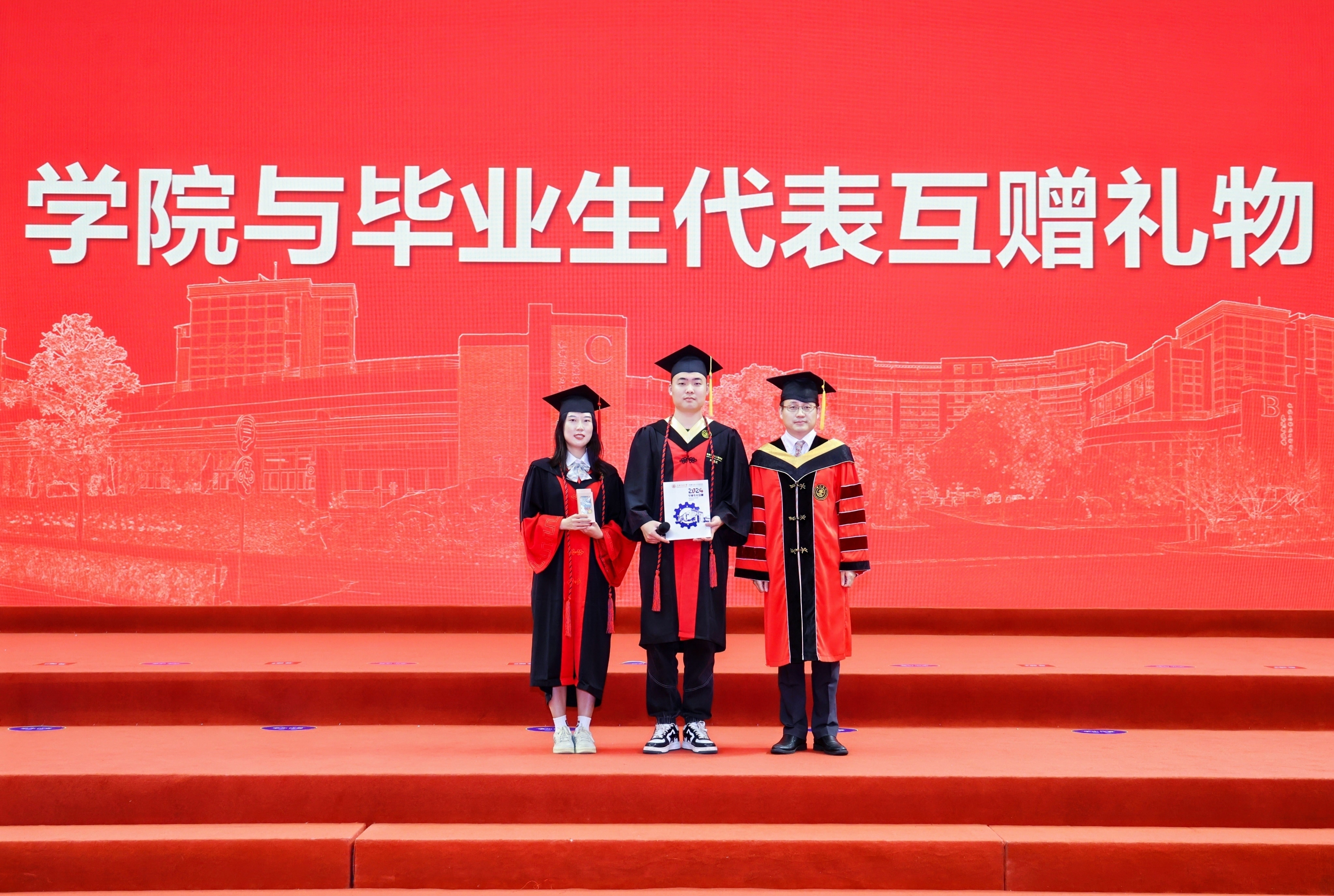 本届毕业生们为公司捐赠了20000余元,祝愿公司的明天更加辉煌。胡永祥代表公司接受赠礼,并向毕业生赠送纪念册、学位服等。