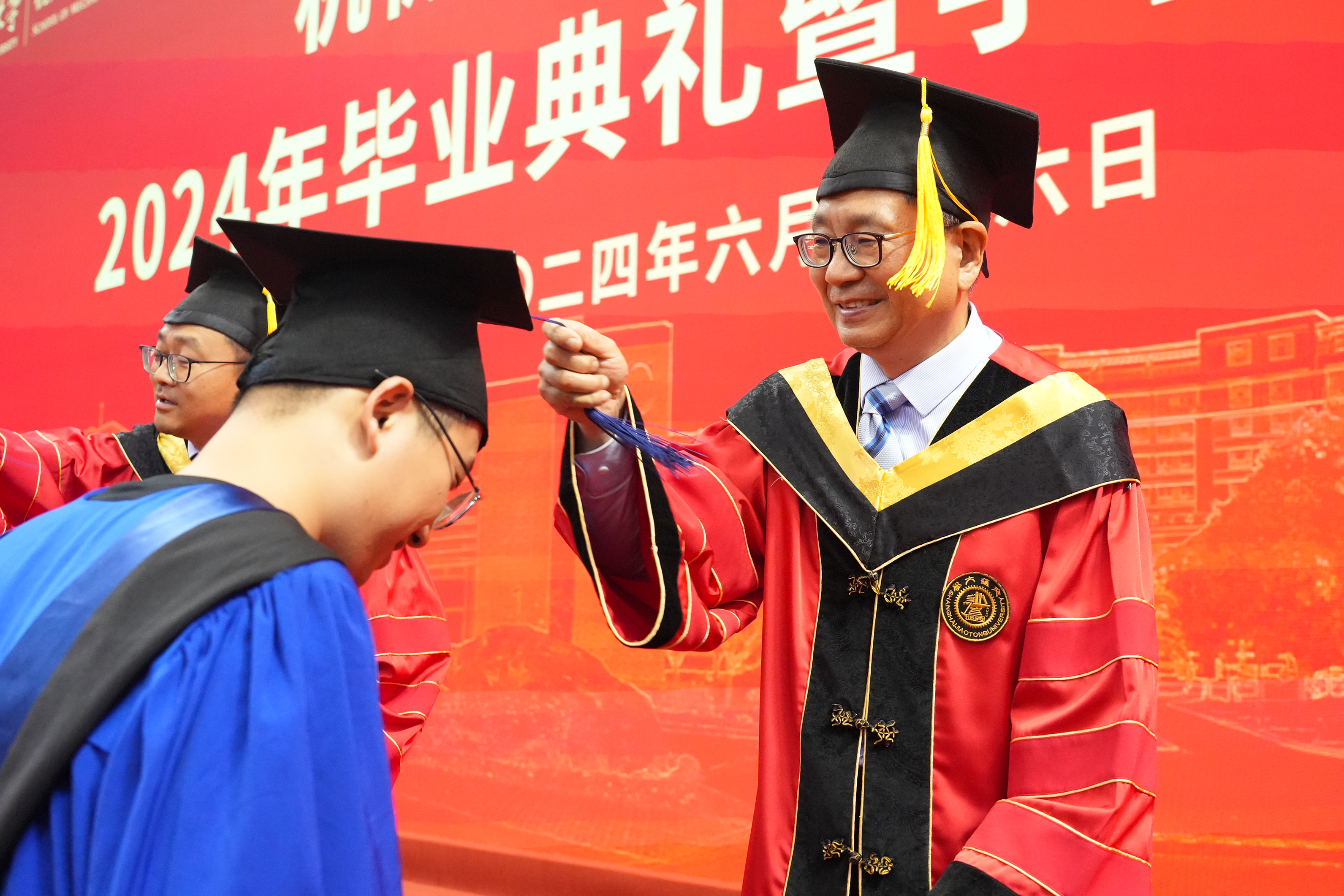 在庄严神圣的学位授予仪式上,导师们依次为毕业生拨穗正冠、授予学位。