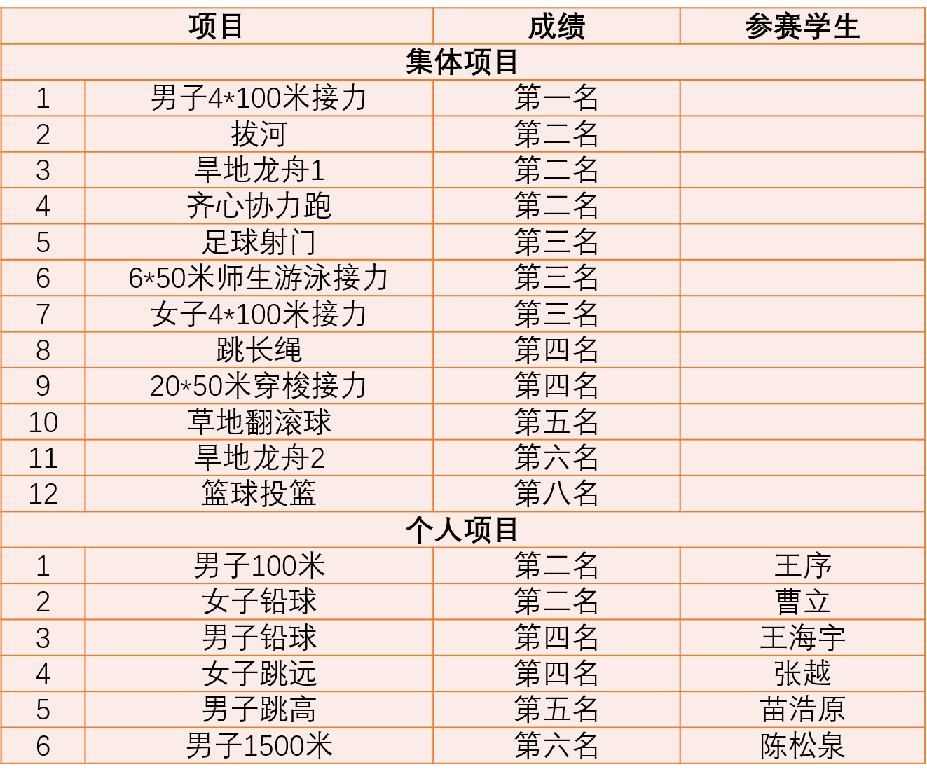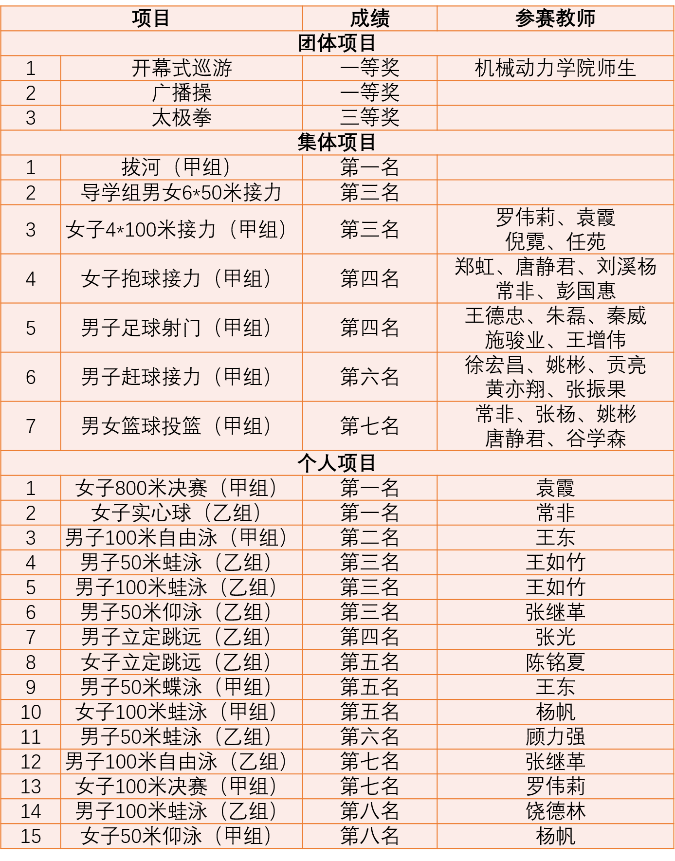 集体项目和个人项目中,公司教职工在拔河比赛、女子800米、女子实心球投远中奋力拼搏,勇夺冠军,公司员工在男子4*100米接力中获得第一名。此外,公司师生在立定跳远、足球射门、男子50米蝶泳、女子100米等比赛中也获得了较好成绩。