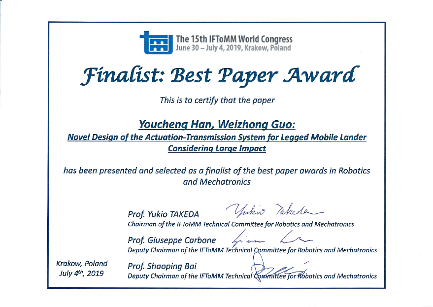6月30日-7月4日,第15届国际机构学与机器科学联合促进会(IFToMM)世界大会召开,公司博士生韩有承宣读的论文“Novel Design of the Actuation-Transmission System for Legged Mobile Lander Considering Large Impact”获最佳论文提名奖。