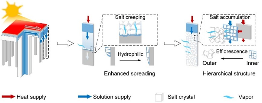 针对太阳能界面蒸发技术处理盐水时面临的盐晶体沉积阻碍蒸发的瓶颈问题,团队通过利用盐晶体爬行和风化过程,并对盐结晶过程进行调控,使得盐晶体自组装成为有利于蒸发过程的分层多孔蒸发器,将盐结晶从传统认为的蒸发抑制因素转变为促进因素。研究构建的分层多孔盐晶体蒸发器能够实现被动溶液输运、快速蒸汽扩散和稳定热量输运,在处理27.3 wt%盐度的浓缩海水时实现了18.78 kg m-2 h-1的蒸发速率和盐-水完全分离的零排放处理效果,理论盐产率相较以往研究高出一倍以上,并实现了浓缩海水在10天测试周期内的连续稳定蒸发结晶。