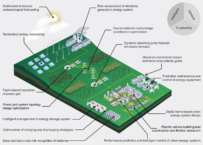 全球碳达峰、碳中和目标的提出为能源领域带来了机遇和挑战,人工智能可挖掘大量能源数据中有价值的信息实现节能降碳,广泛应用于各类能源系统中,增强了智能化设计、运营和维护能力。然而,当前能源人工智能模型多针对特定任务设计,例如光伏预测、储能热失控诊断、能源优化控制等,仅能针对单一任务给出决策,无法灵活指定任务。此外,当前AI方法使用的模态单一,无法整合和充分利用时序、图像、文本和语音信息,充分挖掘多任务间模态的关联信息,同时缺乏人类监督机制,以及领域知识的强化、自学习和可解释性等方面的考虑。未来能源系统将存在物理结构复杂和能源任务多样的特点,下一代的能源领域人工智能将面临着多模态、灵活性和通用性的挑战。