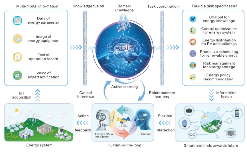 近日,制冷与低温工程研究所晋欣桥、杜志敏课题组在Cell Press旗下Cell Reports Physical Science上发表题为“Next-generation generalist energy artificial intelligence for navigating smart energy”的论文,构建了下一代能源系统通用人工智能的前瞻性框架,旨在利用灵活多模态信息解决能源系统的多模态任务,通过结合能源领域知识提升可解释性,并基于人在环交互持续强化,建立一个面向未来能源变革的可信、安全、智能的通用能源人工智能应用新范式。博士后朱旭和博士生陈思良为论文共同第一作者,杜志敏副教授为本文通讯作者。