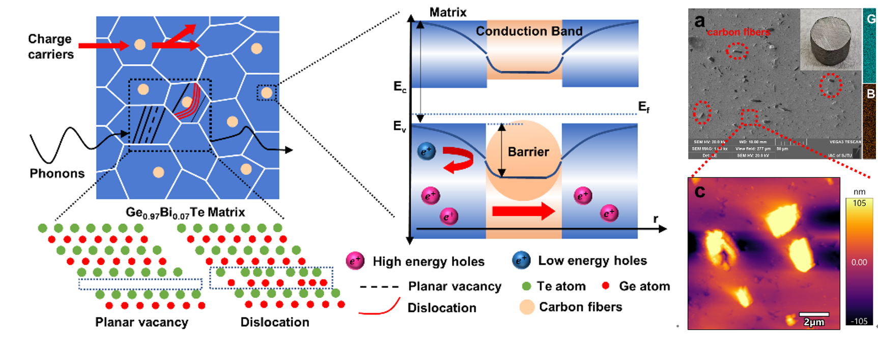 由于碳纤维与GeTe基热电材料的功函数差异匹配,当两者接触时费米能级会趋于一致,从而使得能带在两者界面处发生弯曲,弯曲的能带成为阻碍载流子通过界面运输的势垒,形成能量过滤效应。该势垒的存在可以过滤掉向低温端聚集的低能量载流子,提高GeTe基材料低温端的空穴平均能量,从而显著提高塞贝克系数(图二)。研究通过对比不同碳纤维掺杂浓度样品的电输运性质,发现掺杂0.9 wt%碳纤维的Ge0.97Bi0.07Te样品的塞贝克系数最大达到230μVK-1,同时由于碳纤维掺杂引起费米能级的变化,掺杂后的样品载流子浓度进一步降低,最终热电功率因子最高达到40μWcm-1K-2。
