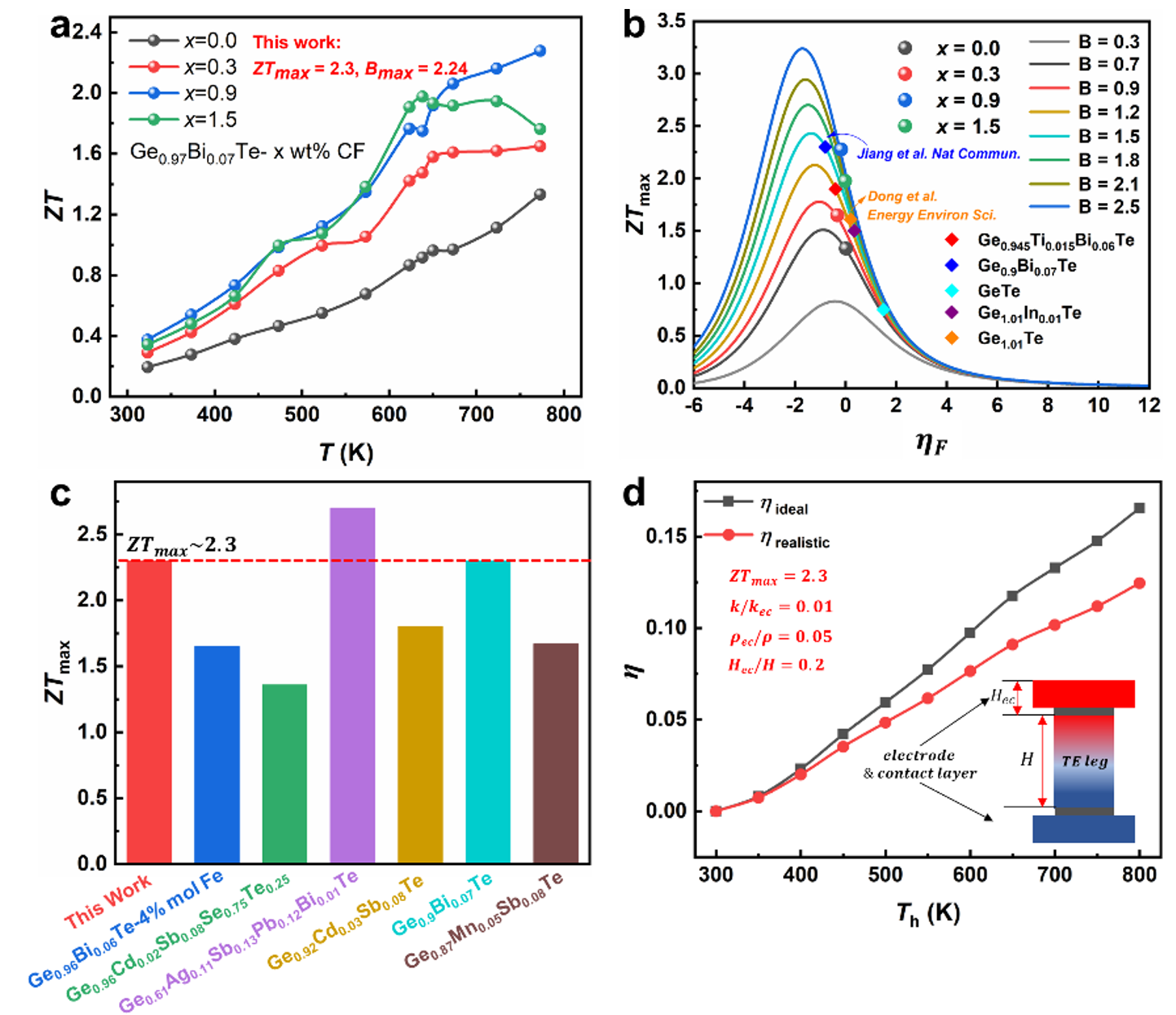 图一:(a)不同碳纤维掺杂浓度下热电优值ZT随温度的变化;(b)不同品质因子下ZT最大值与约化费米能级的关系;(c)该研究与其他相关报道ZT最大值对比;(d)理想条件或真实条件(考虑界面电阻与热阻)下单腿热电器件的理论热电转换效率